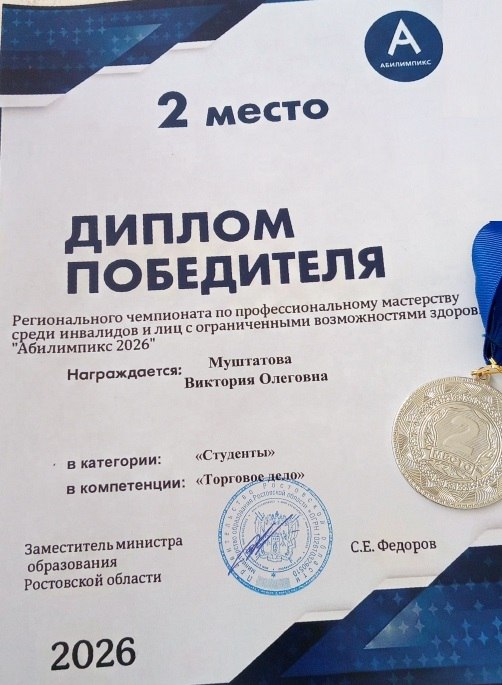 Поздравляем студентку Муштатову Викторию Олеговну и её наставника, преподавателя Нощенко Викторию Петровну, с достойным результатом на региональном чемпионате по профессиональному мастерству среди инвалидов и лиц с ограниченными возможностями здоровья «Абилимпикс 2026».